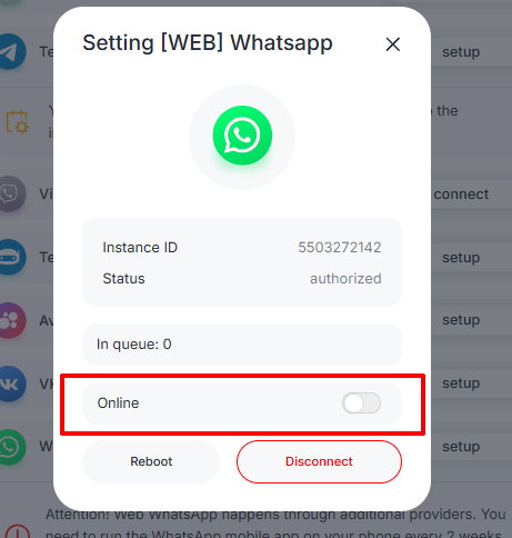 Go to the line settings, click “Disconnected” and scan the QR code from the mobile application of the desired account.