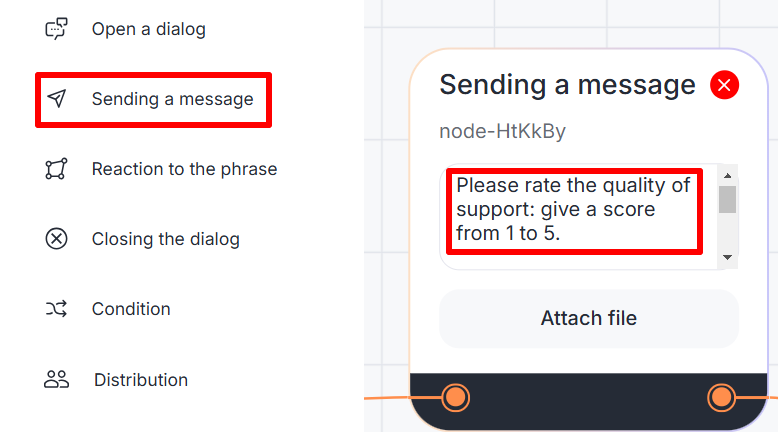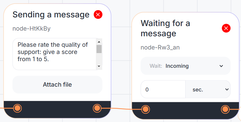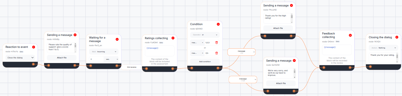The block can be used, for instance, in a technical support scenario. After the dialog is closed, the bot will send a message to the client requesting a rating and save the response in the “Feedback” field within the “Metrics” section using the “Rating Collection” block. Depending on the given rating, an appropriate follow-up message will be sent. Then, the bot will ask the client to provide detailed feedback on the support service and save it in the “Feedback” field within the “Metrics” section using the “Feedback Collection” block.