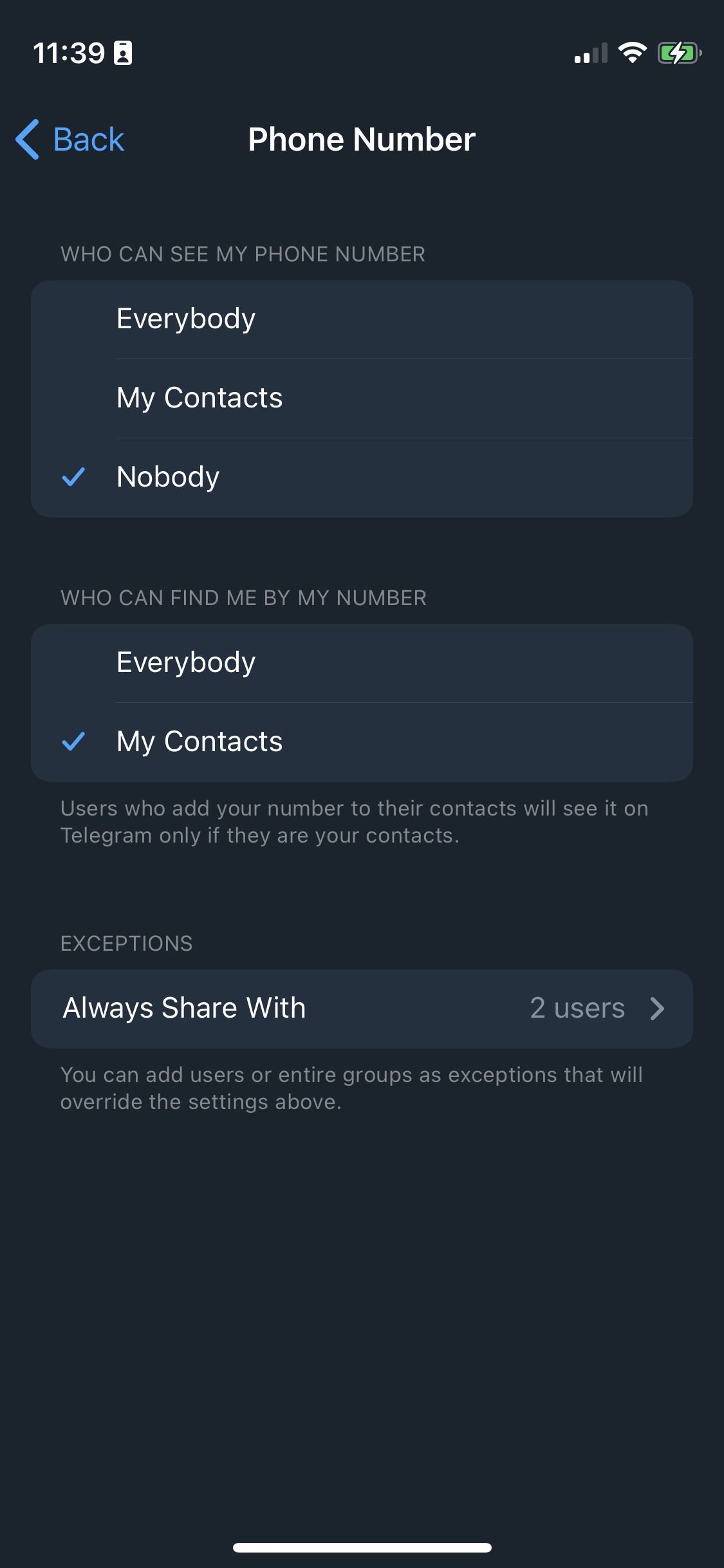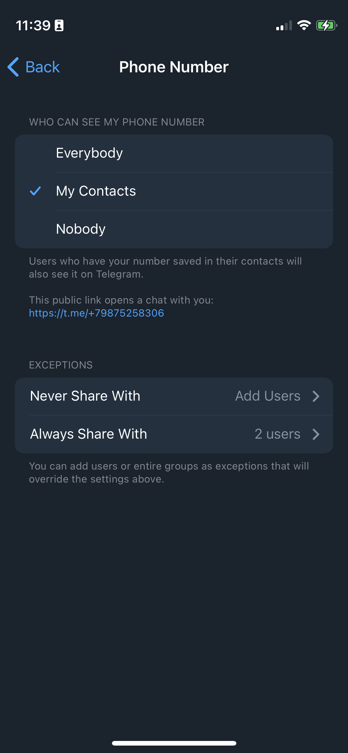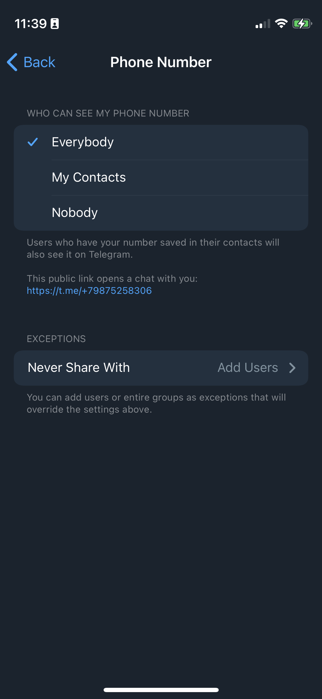- If “Nobody” is set in the “Phone number” field in the privacy settings, then this contact cannot be contacted by phone number.