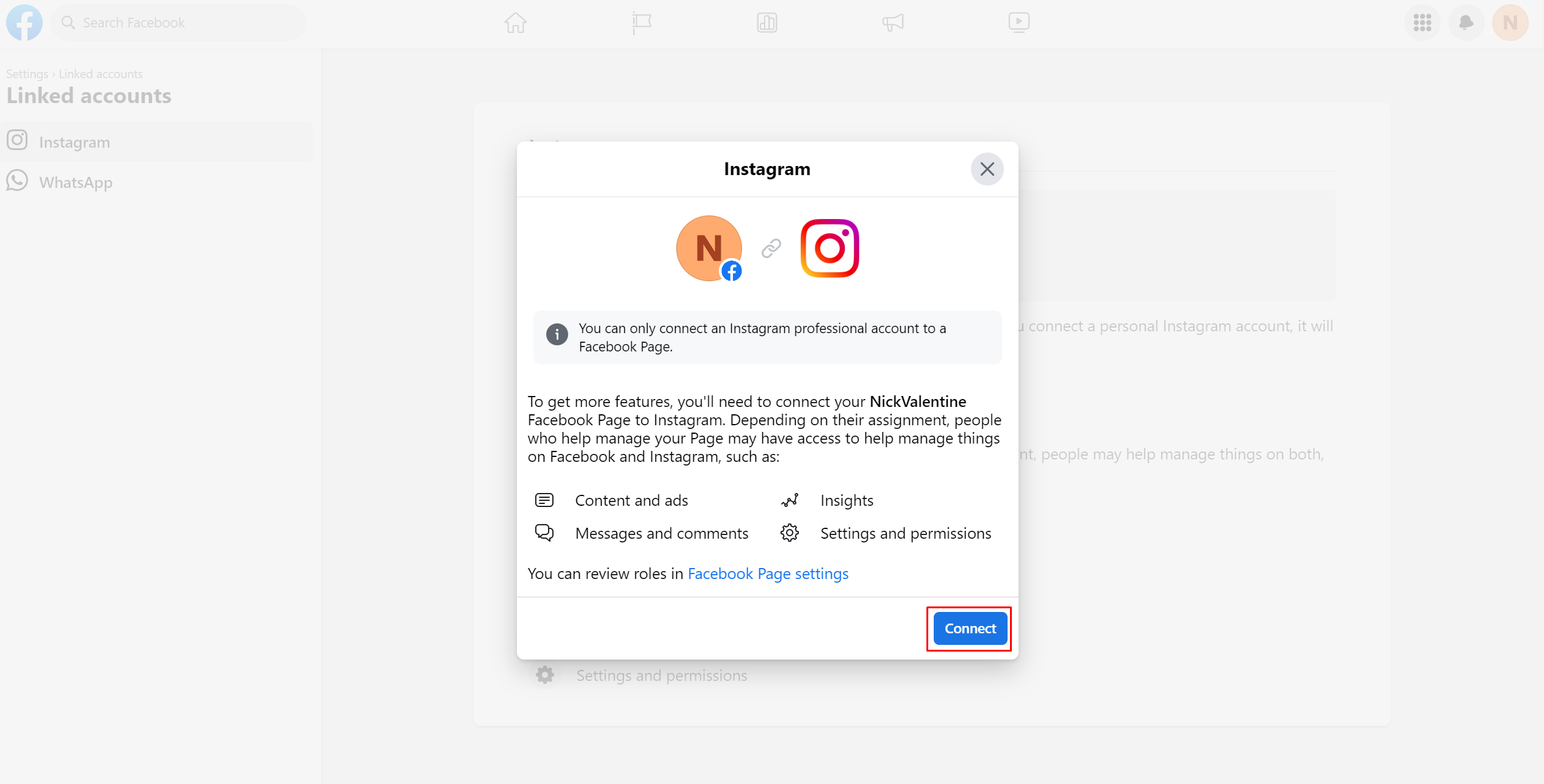 Link an Instagram business account to a Facebook business page