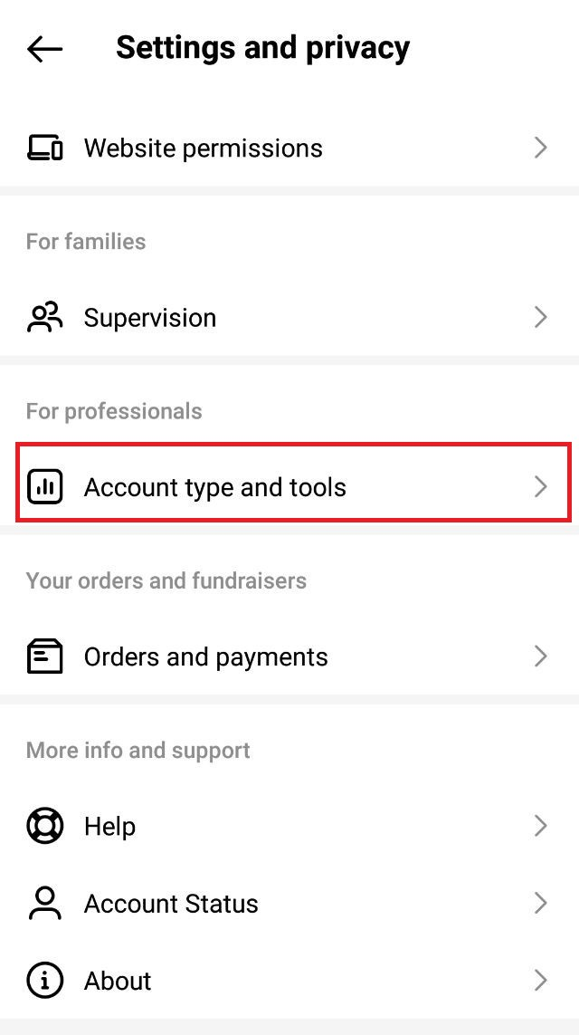 3. Select “Settings and Privacy”, under “For Professionals” select “Account Type and Tools”.