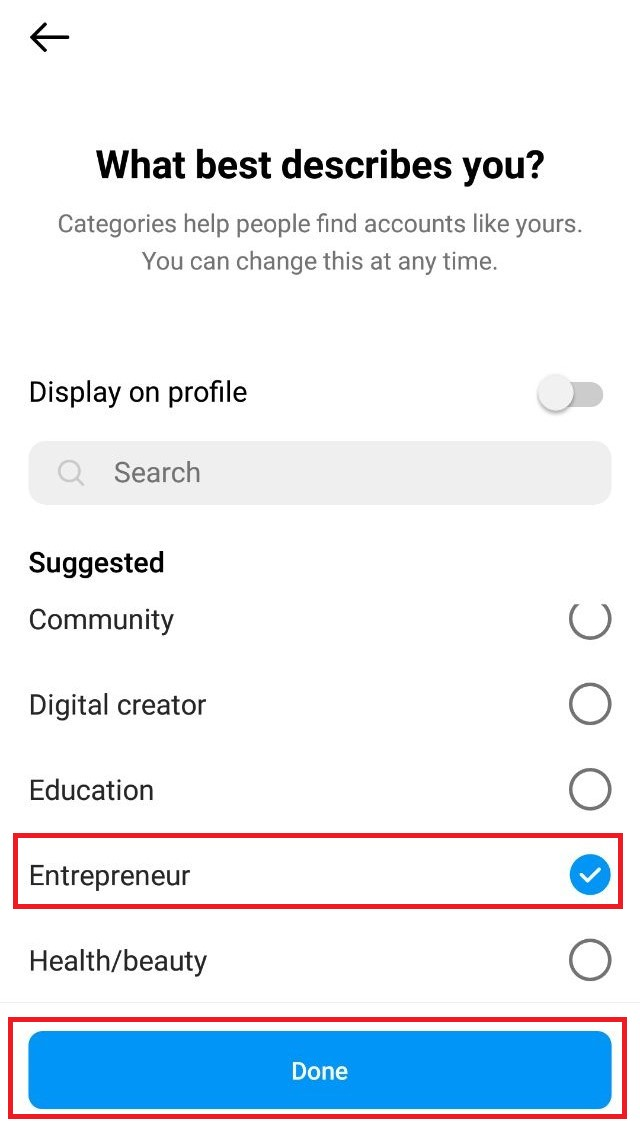 5. Select a category for the business account and click “Done”.