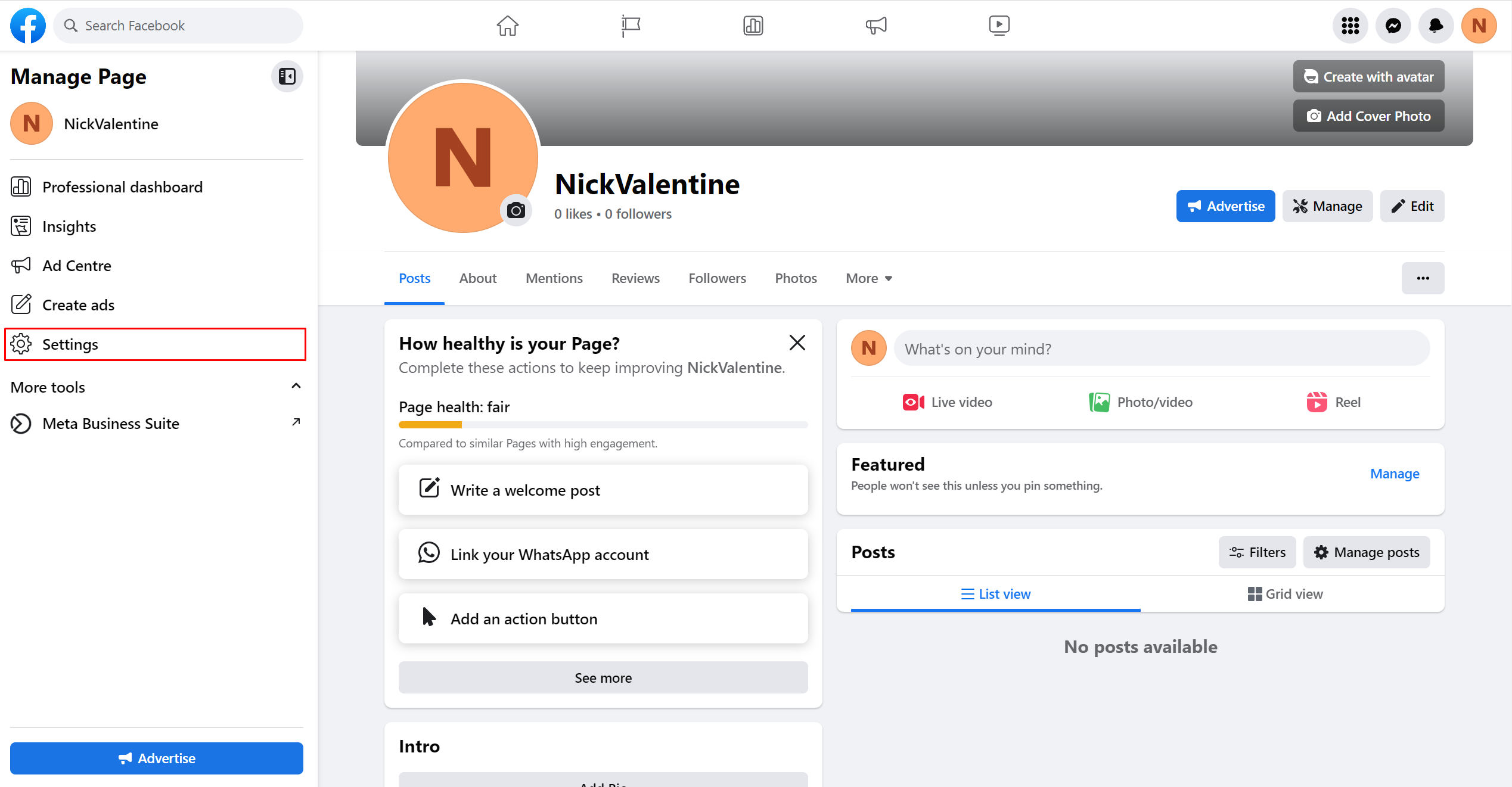 1. Go to “Settings” on the left side of your Facebook business page.