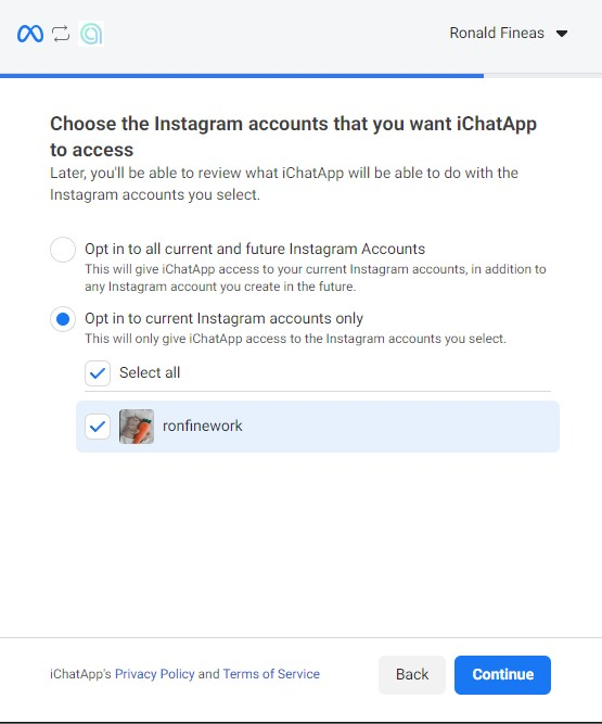 8. Select the Instagram* business account you are linking to and click Continue. You can select multiple accounts at once.