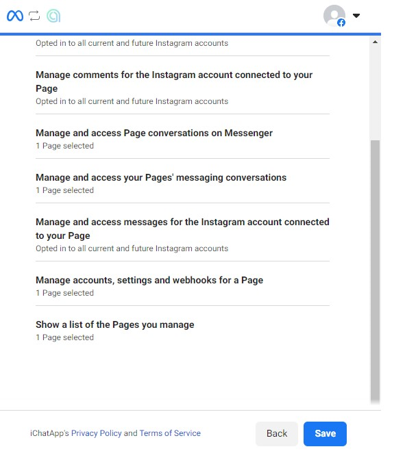 7. Select the Facebook* business page to which your Instagram business account is linked and click Continue. You can select multiple business pages.