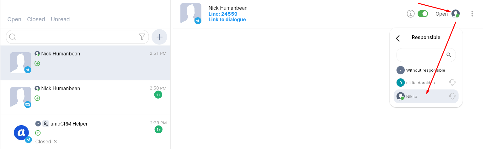 When the operator ends the shift, and the client’s problem has not yet been resolved, the dialogue will automatically be redistributed among the operators on the line. This happens if the issue takes more than one day to resolve. But sometimes it is necessary to pin a dialogue to a specific employee, for example, this is relevant for sales departments. Nobody wants to find out that a colleague closed your deal. So, ChatApp implements the ability to pin dialogues to an employee.