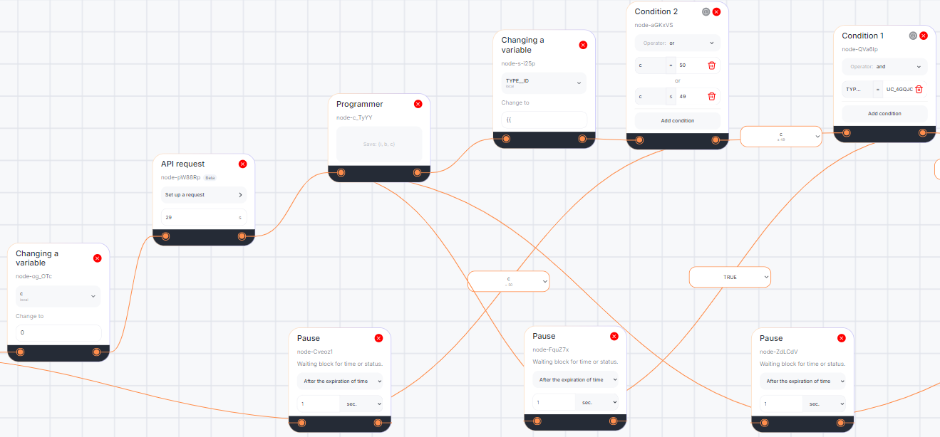 19. After the second «Condition» block, place a «Pause» block so as not to reach the limit on executing blocks per second.