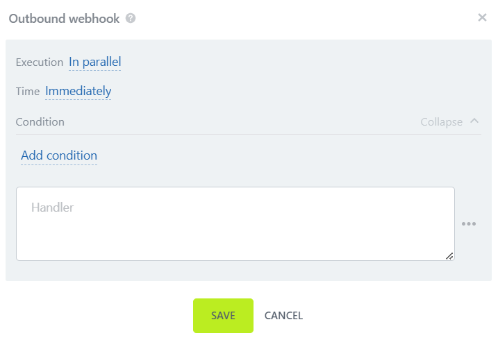 - Add the «Outgoing Webhook» robot to the «Started» stage. To do this, click on «+» and select «Outgoing webhook».