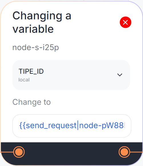To do this, enter double curly braces «{{» and select the «data» result of the «API request» block. In the result after «data» add «.result[i].TYPE_ID». You will get a result like this: {{send_request|node-pW88Rp|data.result[i].TYPE_ID}}.