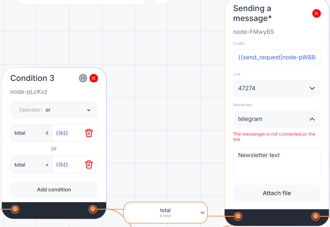 22. Add the «Sending message*» block if total≥b – the check has not reached the end of the mailing.