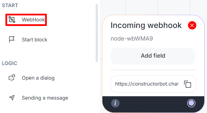 - In the robot settings, you need to add a link that can be copied in the Bot Constructor from the «Incoming webhook» block. See the section «Creating a script in the Bot Constructor», paragraph 5.