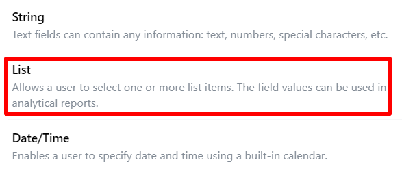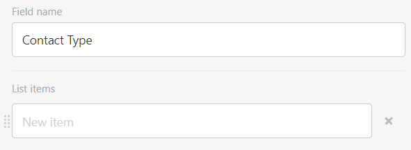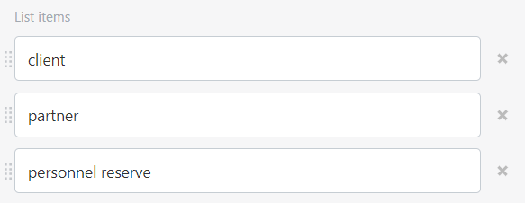 - In the list items, enter the types by which you want to separate the contacts. For example: «client», «partner», «personnel reserve».