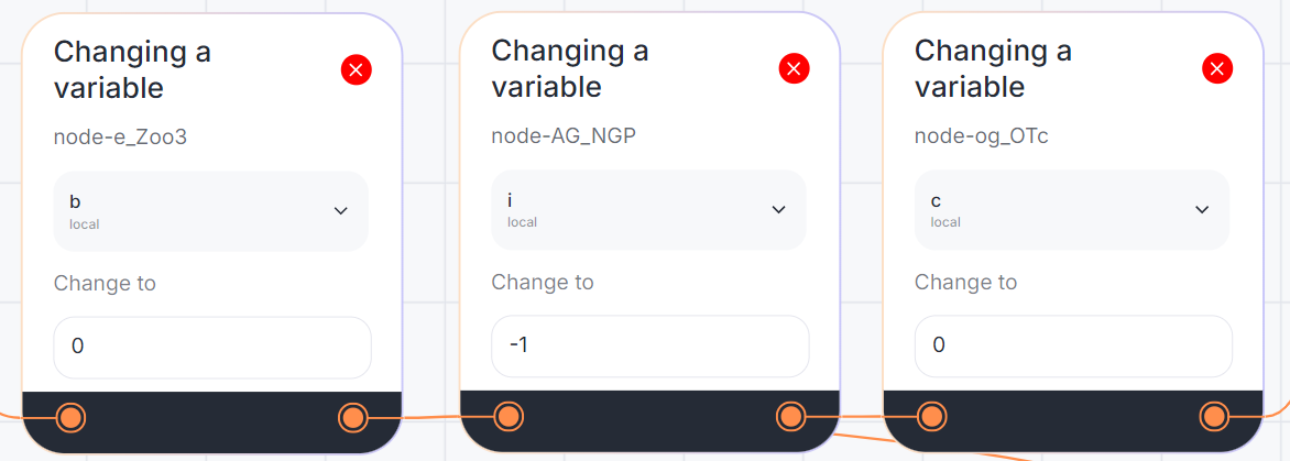 6. Create three «Change Variable» blocks in a row and connect them together.