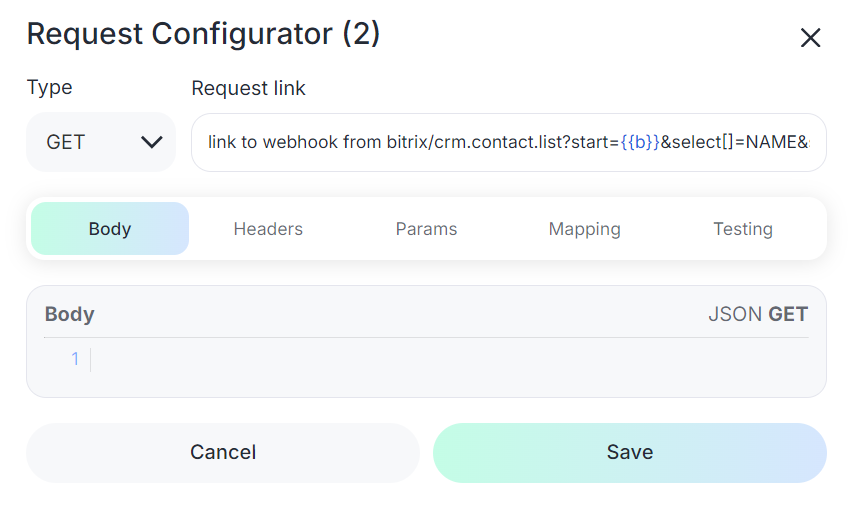 8. In the «API request» block, select «Request type» – «GET» and paste the link from Bitrix24 into the «Request link» field. To get the link, go to Bitrix24 → click «Developers» → «Other» → «Incoming webhook» → copy «Webhook for calling rest api». Provide the necessary rights – click «Privilege Settings» → «+ select» → «CRM» → «Save». The request parameters must be specified in the link: