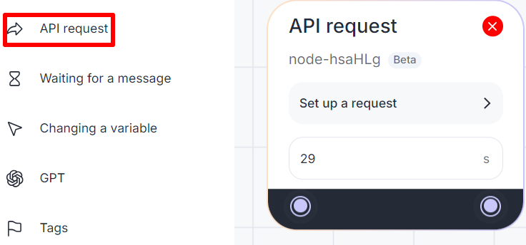 - In the «ChatID» field, enter the result from the «API request» block containing the ChatID. For example, with a phone number. To do this, enter double curly braces «{{» and select the «data» result of the «API request» block. In the result, after «data» add «.result[i].PHONE[0].VALUE». You will get a result like this: {{send_request|node-pW88Rp|data.result[i].PHONE[0].VALUE}};