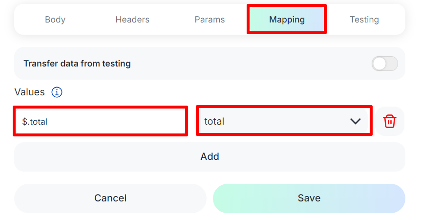 9. In the «mapping» tab of the «API request» block, map the «$.total» result to the variable in the Constructor. Name the variable, for example «total». This is needed to find out how many elements are in the list.