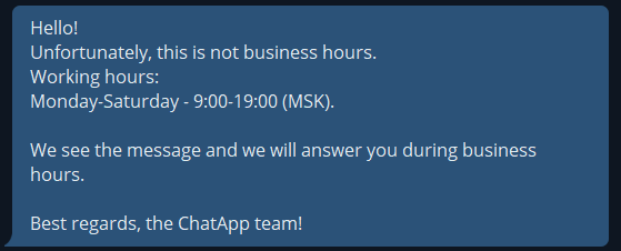 4. In the text, specify the company’s working hours, and the client will receive a corresponding message from the bot. That way the client will know when it will be necessary to address to you again.