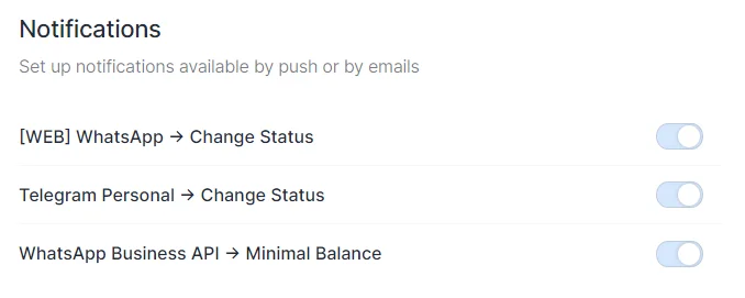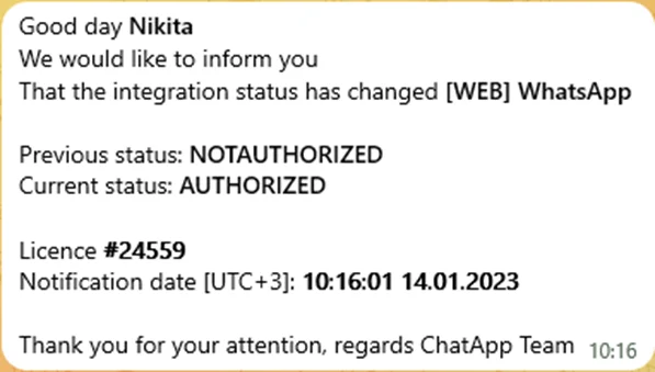 Now, when changing the authorization status in WhatsApp, Telegram, WhatsApp Business API, notifications will be sent to your Telegram private messages.
