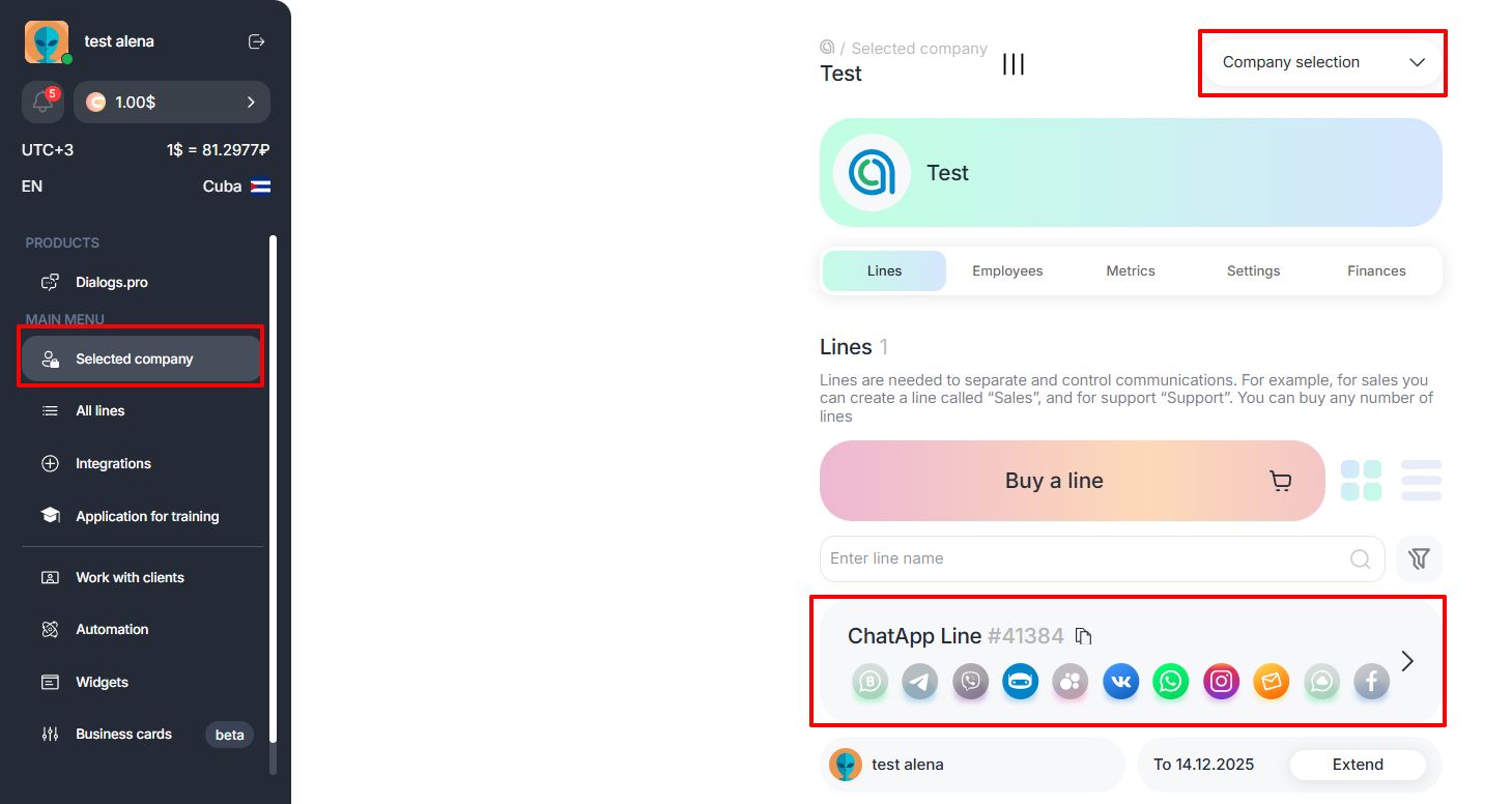 2. Go to the Selected company tab in the left menu and click on the line for which you want to connect notifications.