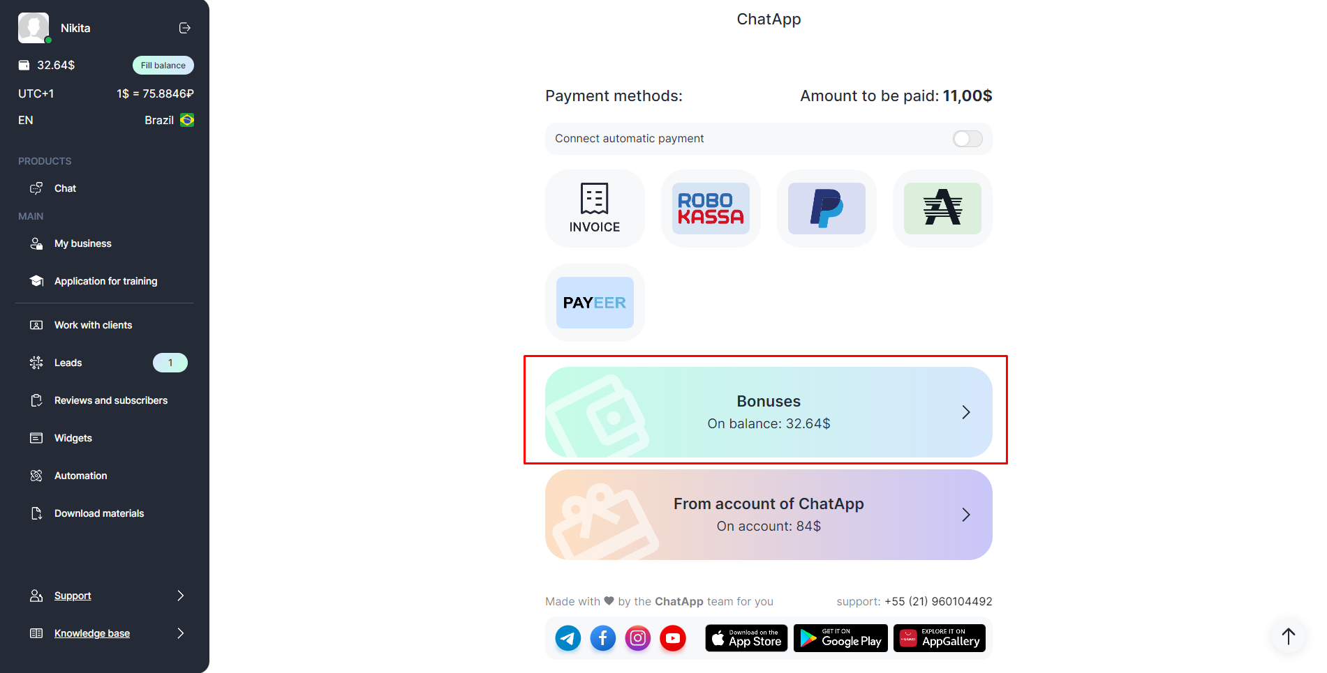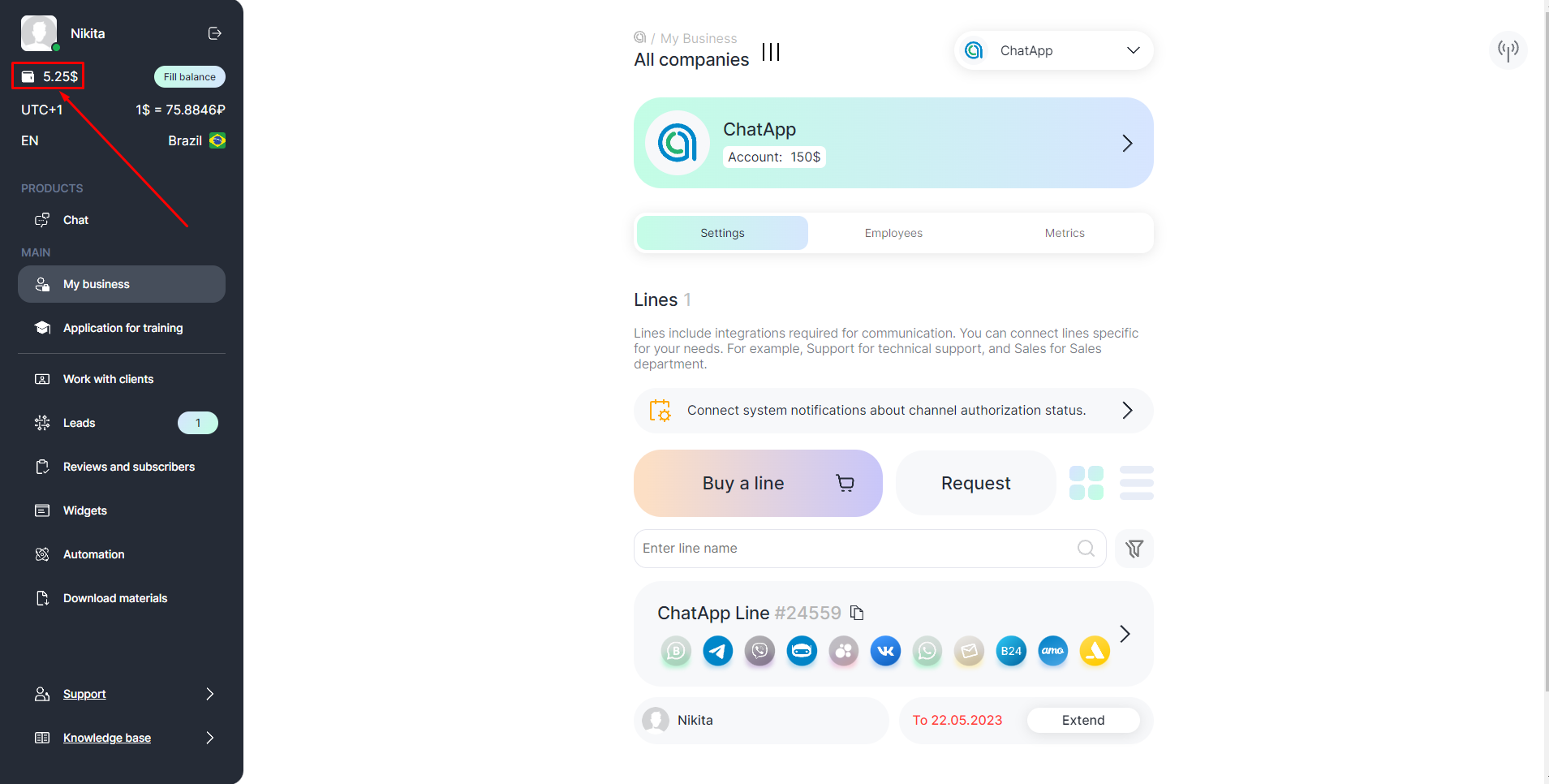 If you buy a line for 12 months, you get a discount, and if the client pays for the line themselves, you get bonuses. Bonuses are displayed in the menu on the left under the profile icon. Bonuses do not belong to a particular company: you can spend them to buy or extend any line. Closing documents are not issued when you pay with bonuses.