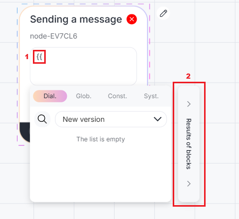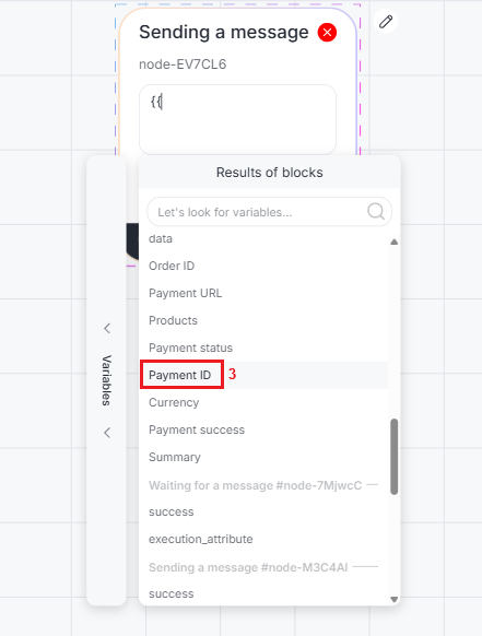 2. Fill in the payment ID. You can insert the result of the “Payment acceptance” block. To do this, enter the double curly brackets “{{” in the field, open the “Results of blocks” section and select the result of the “Payment Acceptance” block — Payment ID.