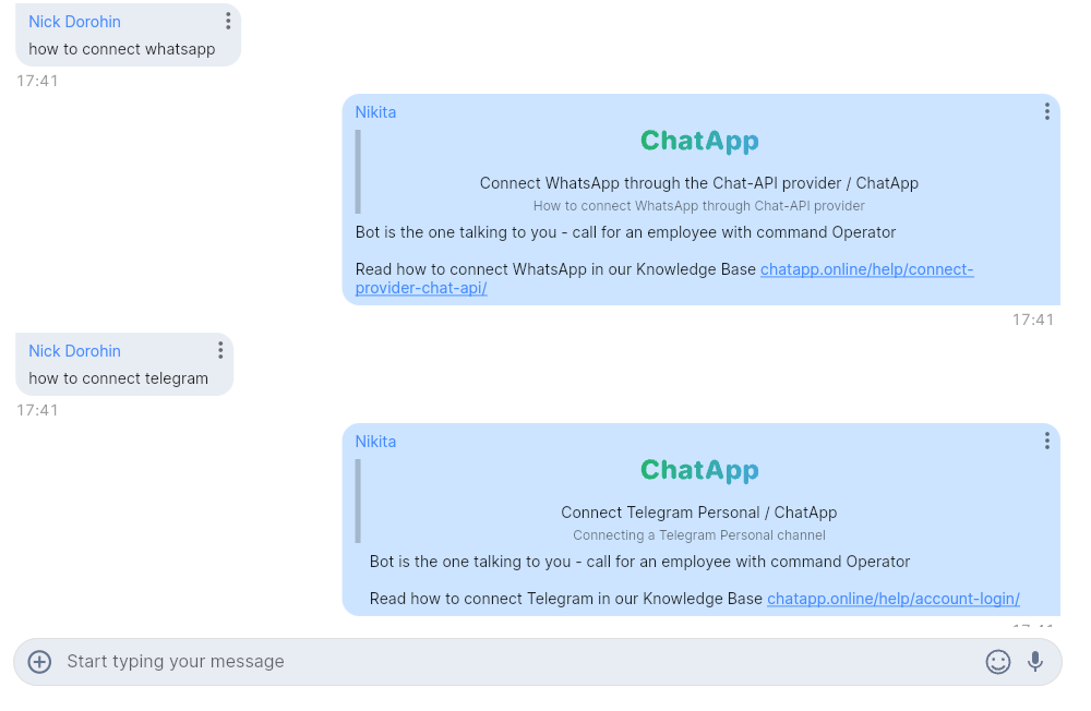 With the help of the Bot for quick responses, you can automate the work in dialogs and reduce the burden on technical support.