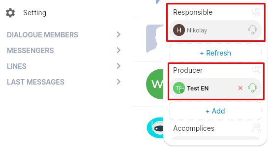 In the left menu in the “dialogue members” section, select an employee to view the dialogues in which he works: