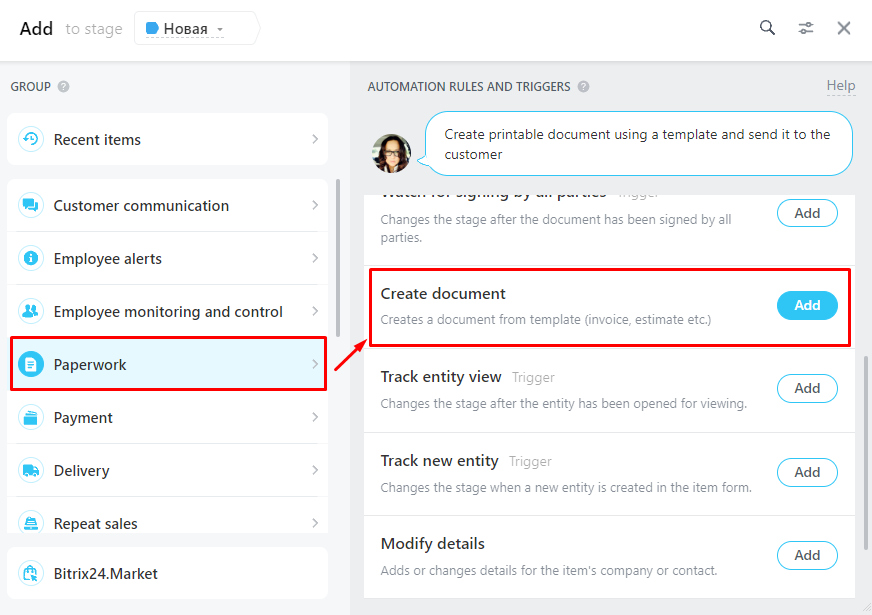 - In the deal, open the automation rule editor and at the stage, for example, the invoice, click on the Add button.