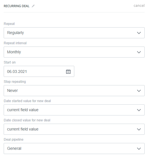 Use recurring deals to automatically create and send out invoices every month. This is a standard Bitrix24 tool. For the procedure for creating a regular transaction, see the bitrix24 help.