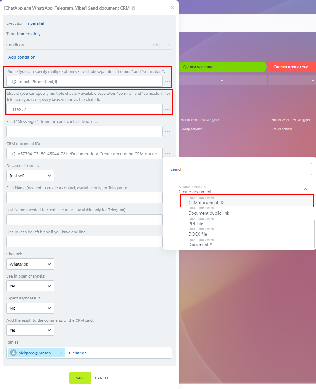 IMPORTANT! Be sure to check the Wait for PDF conversion to complete check box. This flag is required for sending the document to the client in WhatsApp correctly.