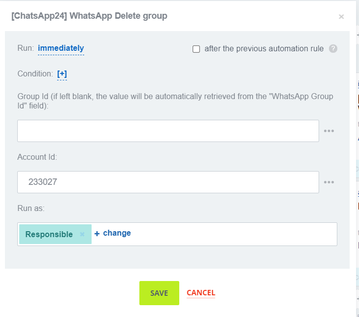 - To receive a notification after deleting a group, the person responsible for the deal should be configured with another automation rule. This way you can find out if an error occurred during uninstallation.