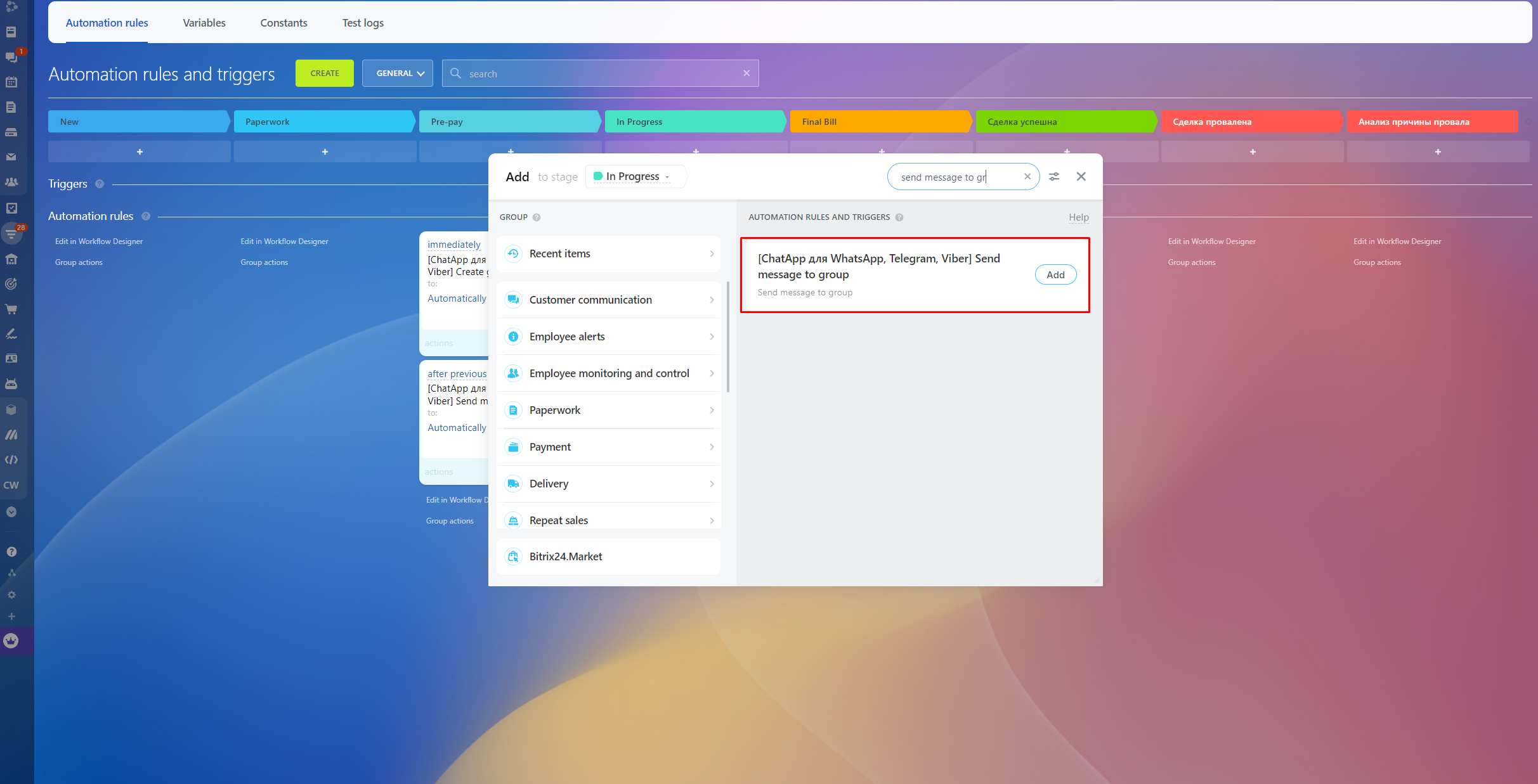 4. To notify the person responsible for the deal after sending the file, configure an additional automation rule from the Bitrix24 standard set. This way, you will be able to know if an error occurred during sending.