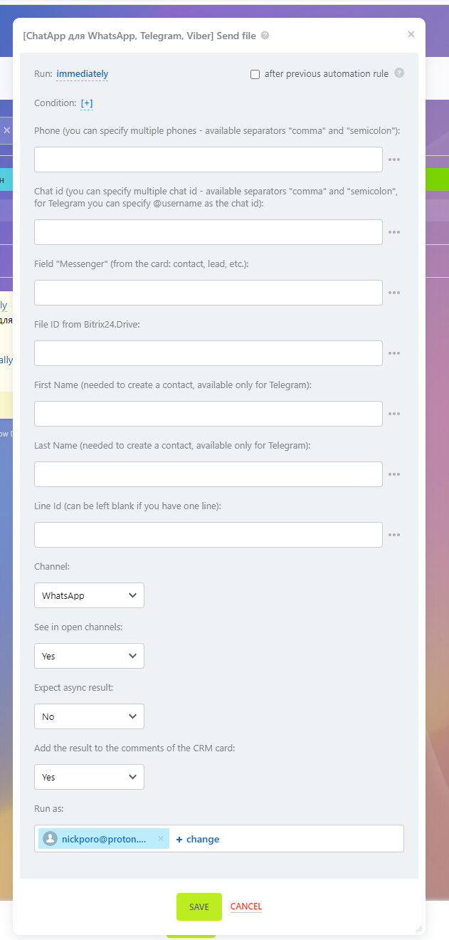 Run as – This is the standard field of the Bitrix24 portal Automation rules. Specify an employee who has CRM data access permissions.