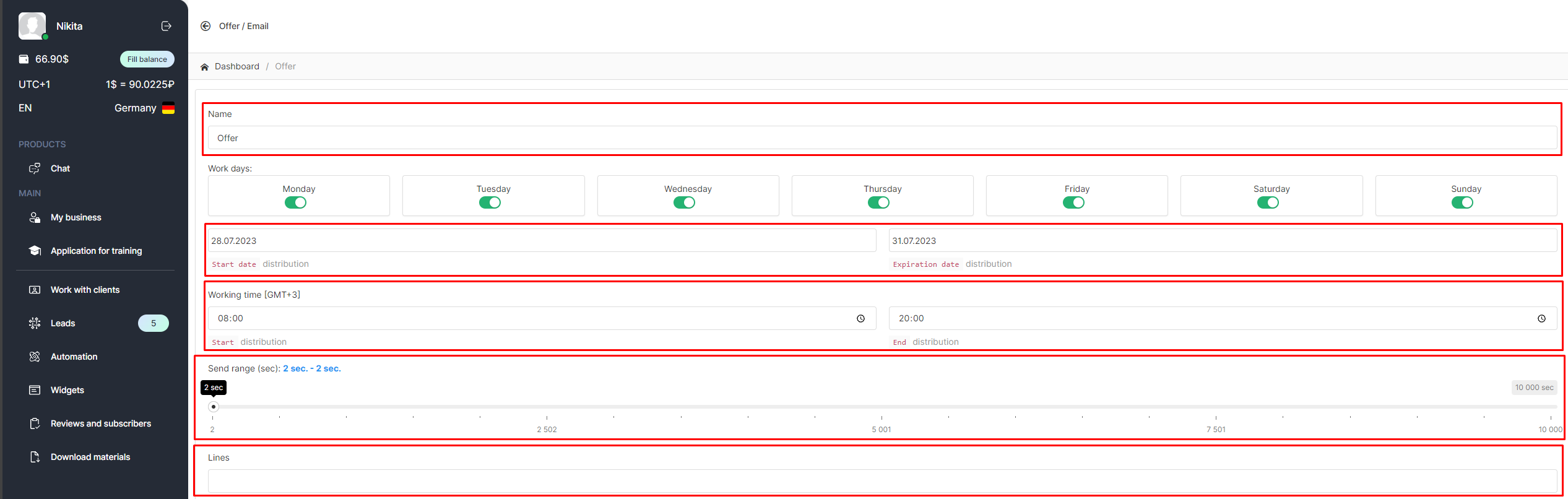 - Specify the line from which the mailing will be sent. You can select several lines, in which case the mailing will be sent one by one from each line, 1 message at a time.