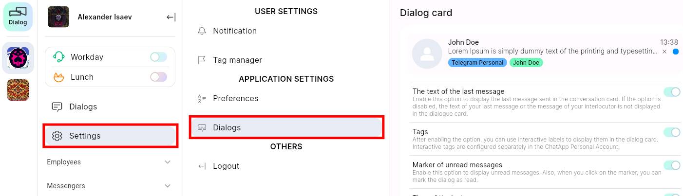 In Dialogs.pro you can configure cards of dialogue and settings for messenger. To do this, go to the “Settings” menu in Dialogs.pro and select the sub-menu called “Dialogs”.