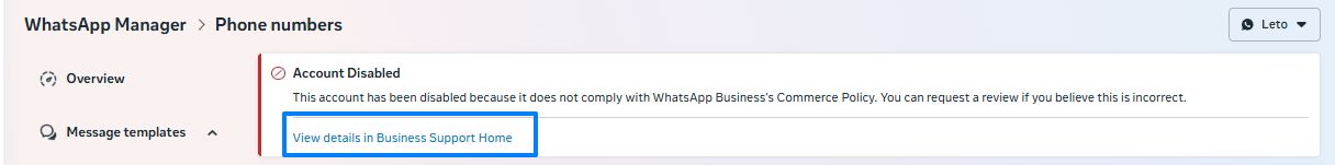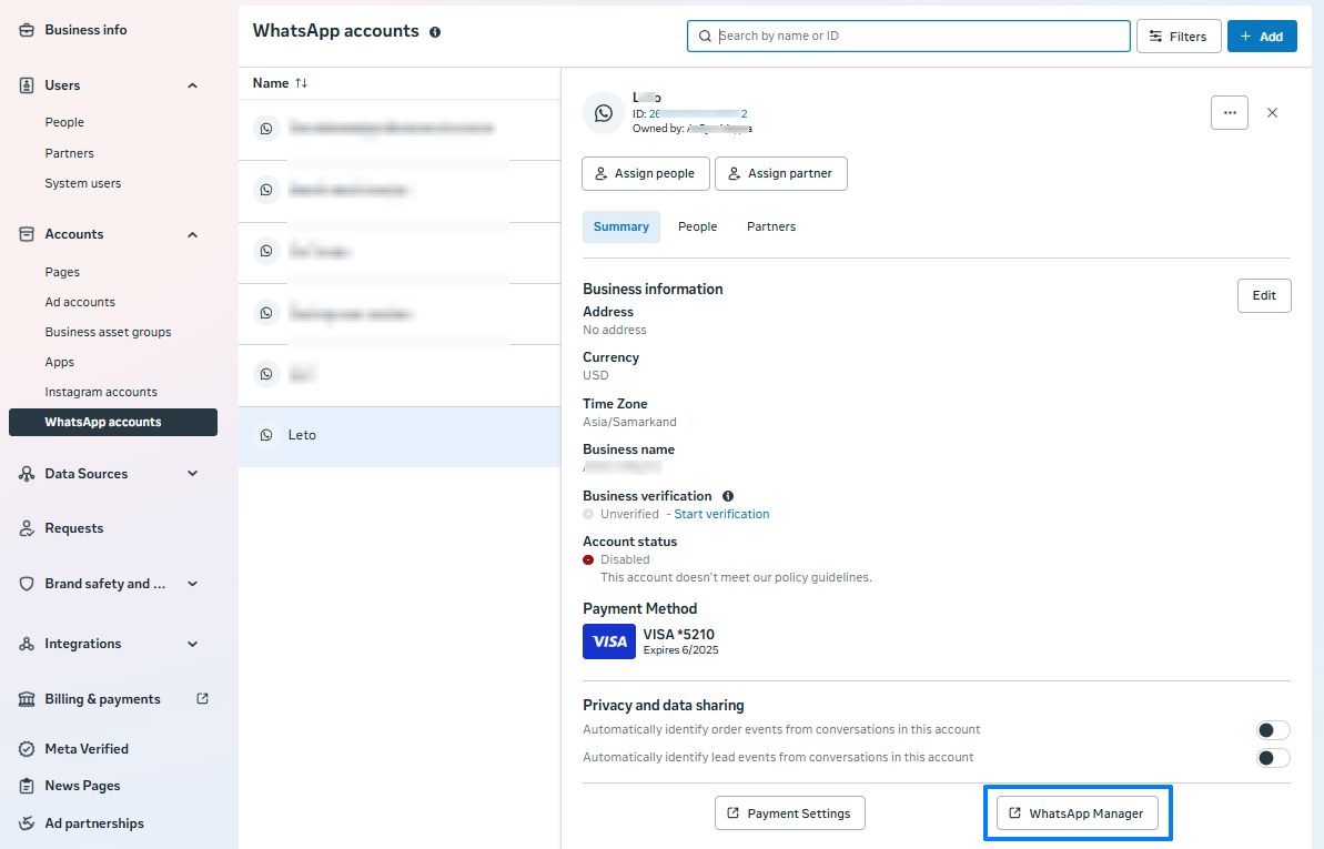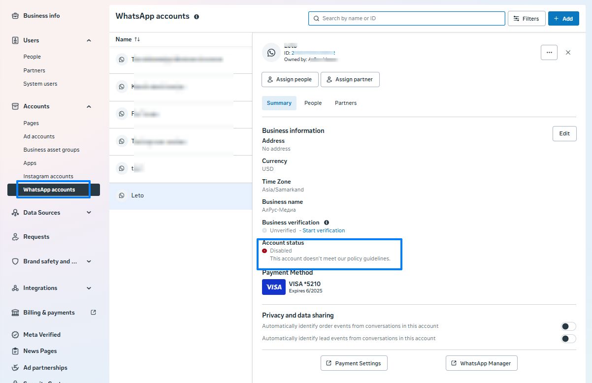 If the account is blocked, it will be “Disabled” in the company settings in the “Accounts” — “WhatsApp Accounts” — “Account name” — “Account status” section.
