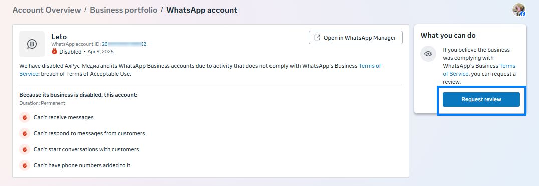 From (company name) we are contacting you with a request to remove the account lock. WhatsApp is an important tool for business and communication with customers for us. Blocking interferes with work.
