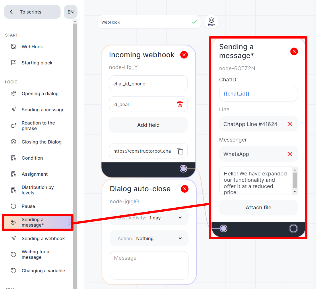Note: the variable “chat_id_phone” is the entity of the contact, which is contacted by phone number, username, and the variable “id_deal” is the entity of the CRM system, that is, the deal. With the help of these two variables, a connection occurs.