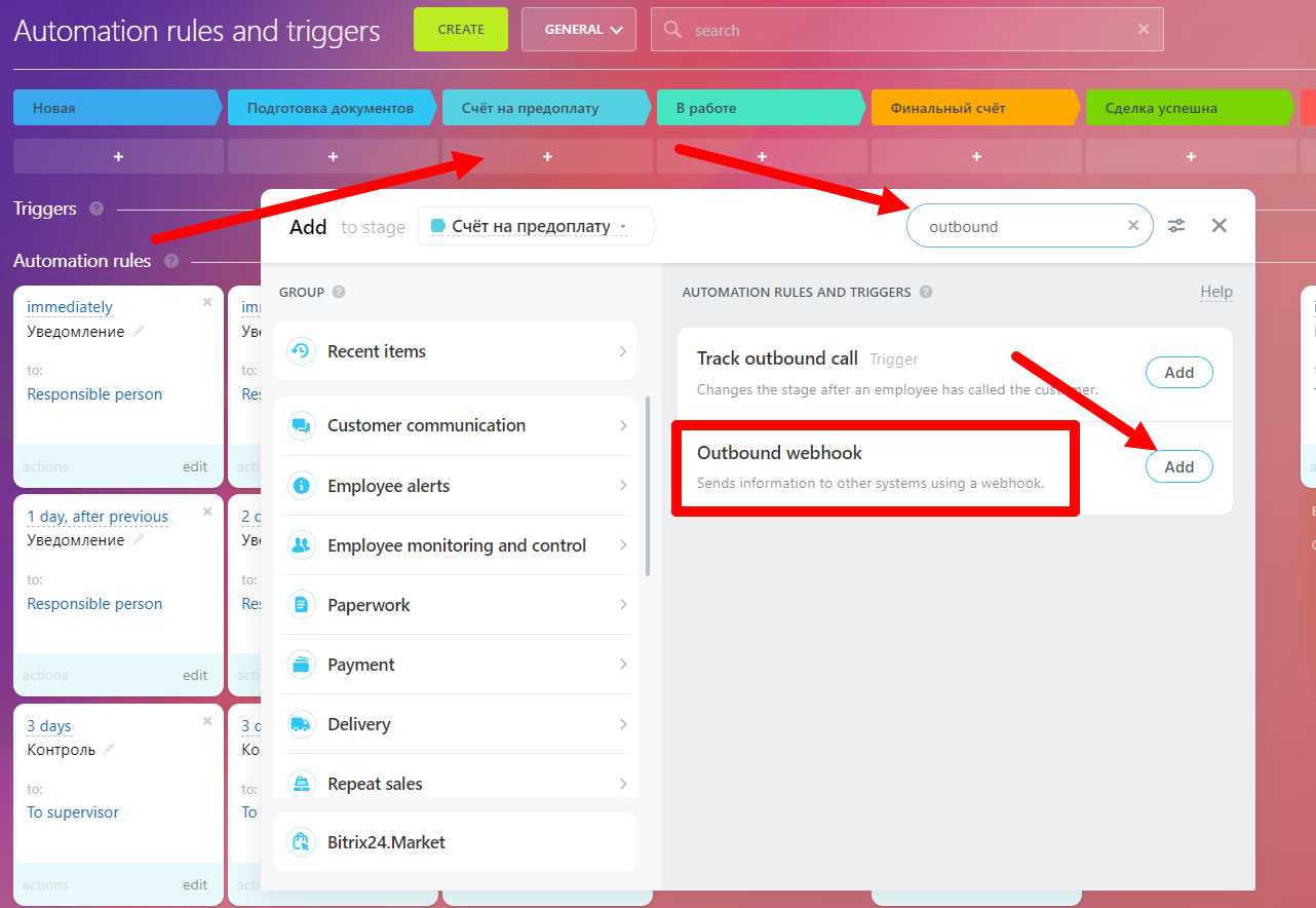 4. Add the “Send webhook” block. Using a webhook, we move the sales funnel to the desired stage in Bitrix24.