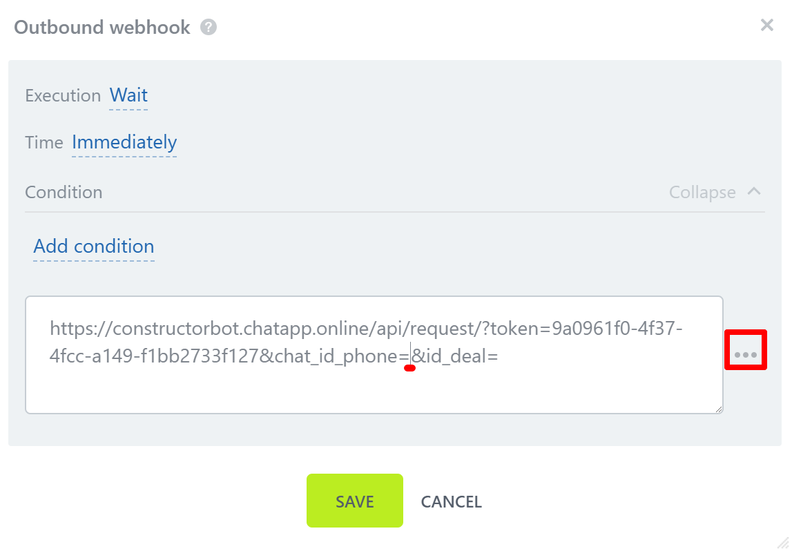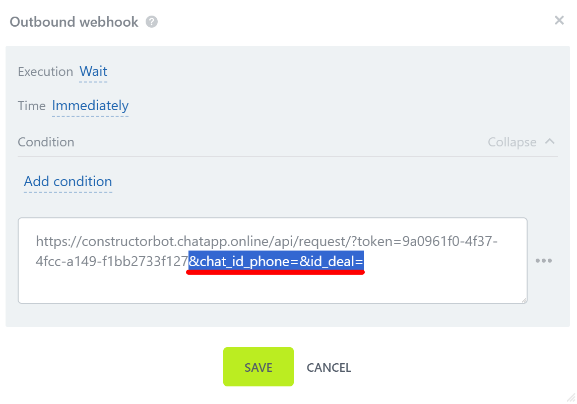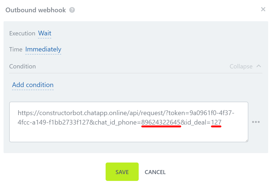 5. Place the cursor after “chat_id_phone=” and click on the button. Through the search, find the variable “Phone (text)”. Place the cursor after “id_deal=” and enter the deal id. Save your settings.