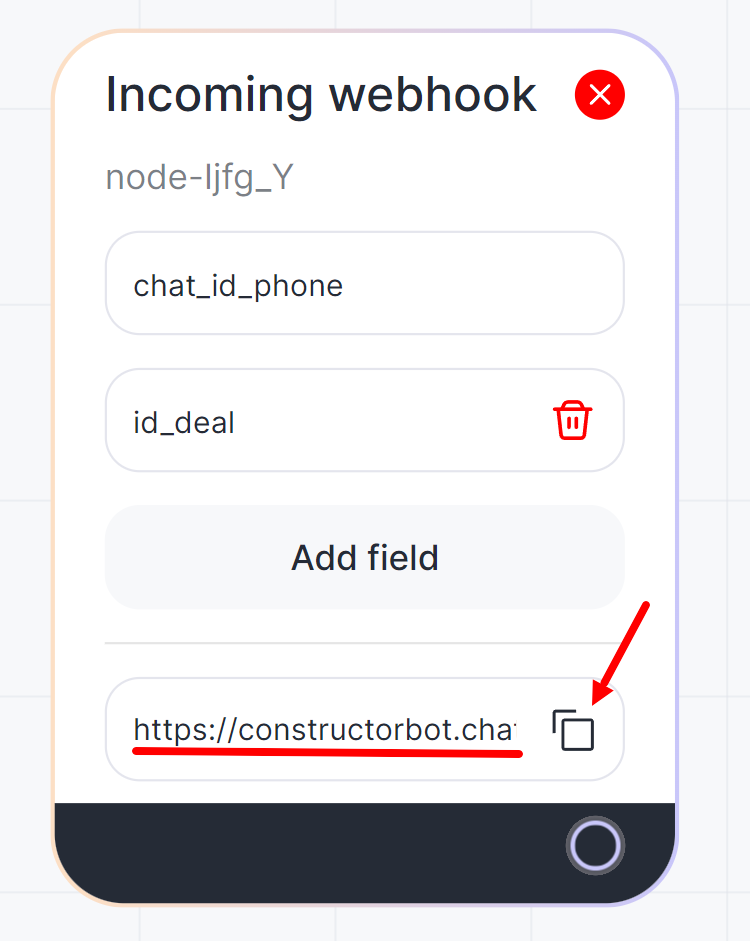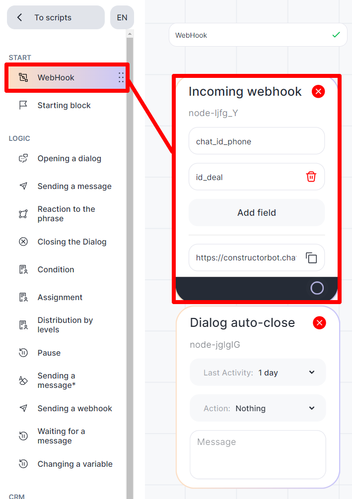 1. Add two variables to obtain contact information. Add 2 fields with variables: “chat_id_phone” and “id_deal” to the “Incoming Webhook” block.