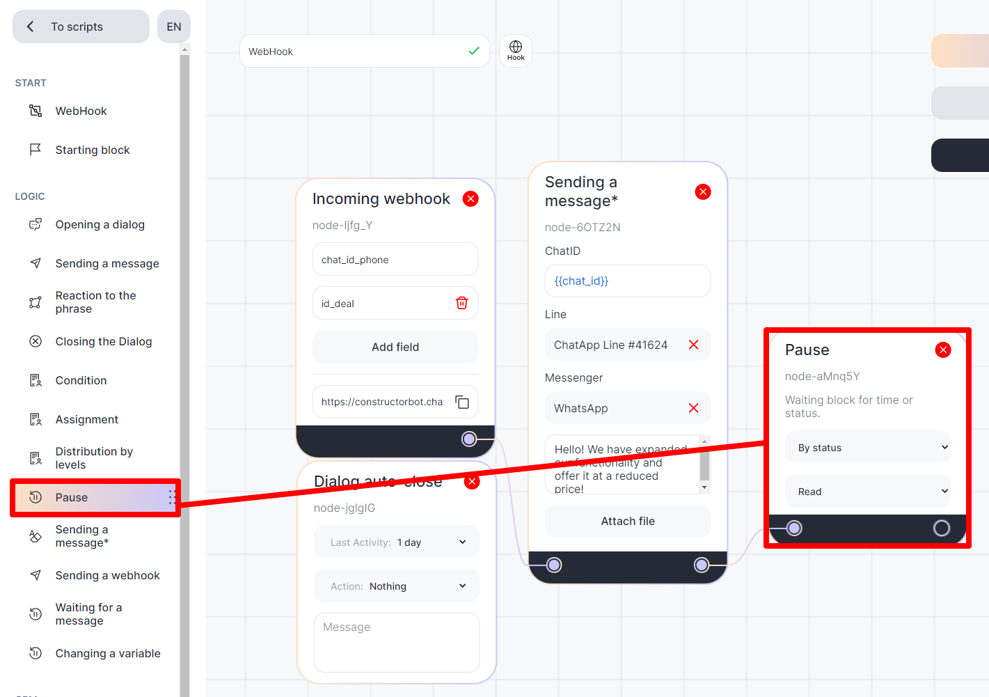 In the Bot Constructor, you can configure the reaction to the message status. This is done in the “Pause” block, where you can select the desired status, for example, “Delivered” or “Read”. Follow the instructions: