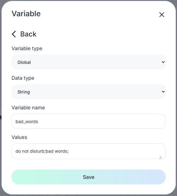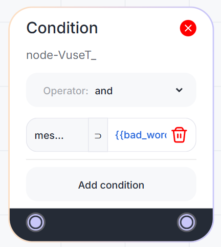 4. Then add the created variable to the “Condition” block. Specify the condition: contains ⊃ or does not contain ∌ {{variable name}}.