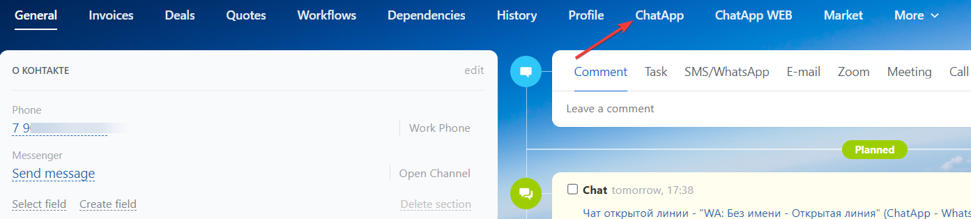 Let’s see an example – to write first from Bitrix24 in WhatsApp to the user from the created deal: