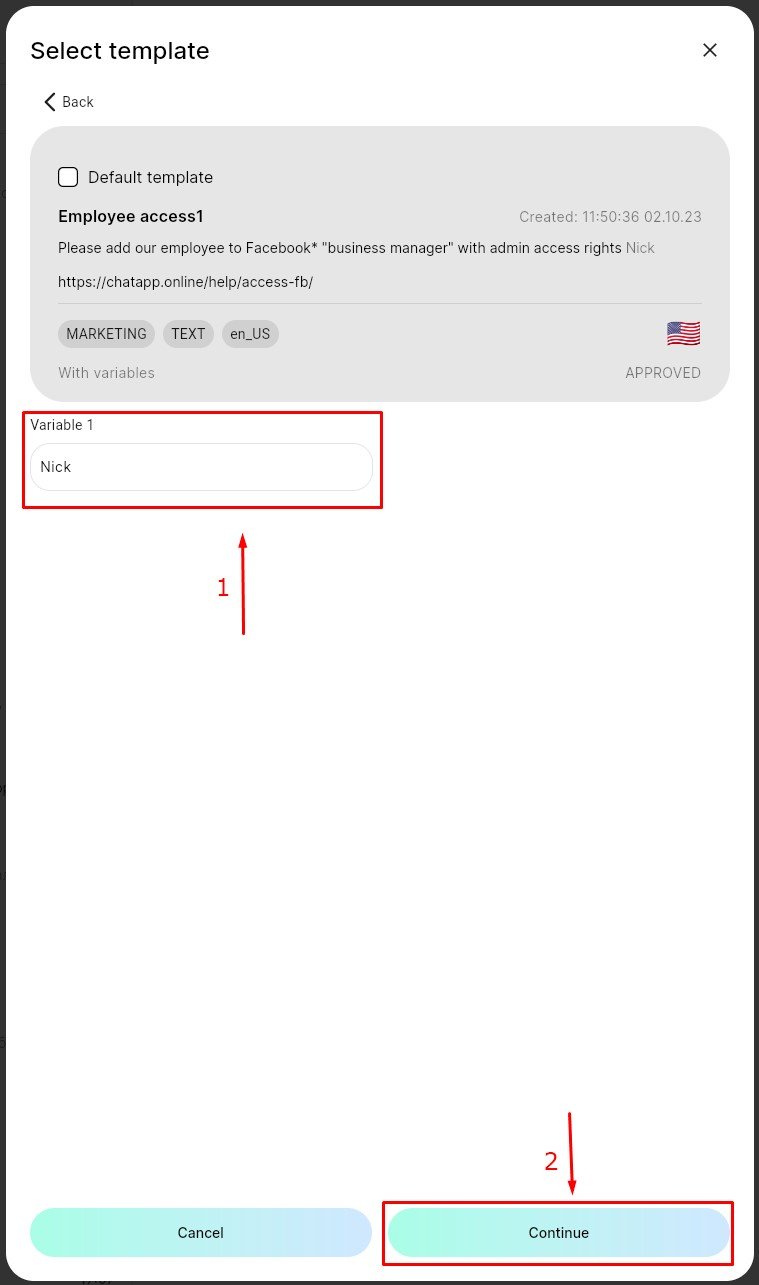 7. Select the desired template. If there are variables present, fill them in. Click “Continue.”