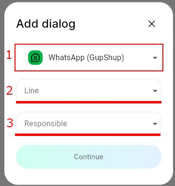 4. In the “Line” field, select the line, and in the “Responsible” field, select the employee to whom the dialog with the user will be attached. Click “Continue”.