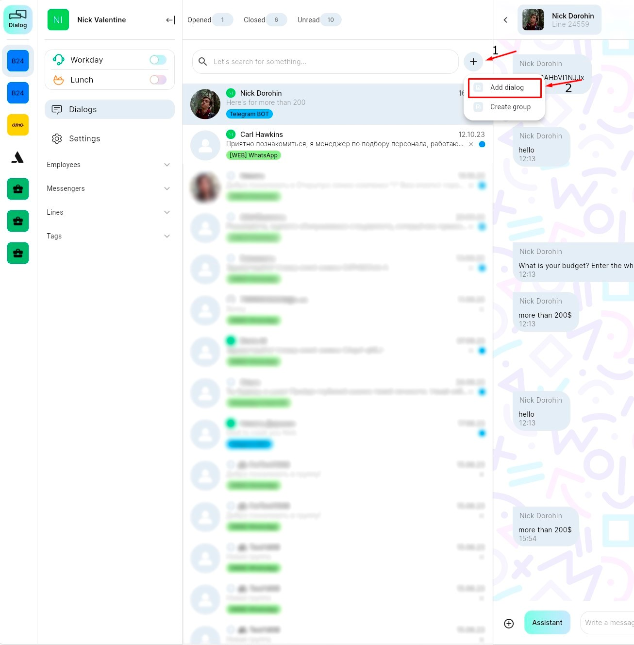 4. New dialog from messenger contacts or CRM