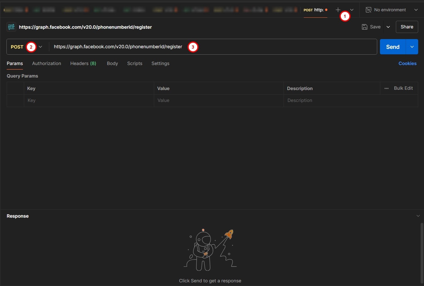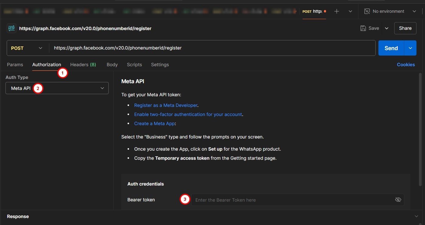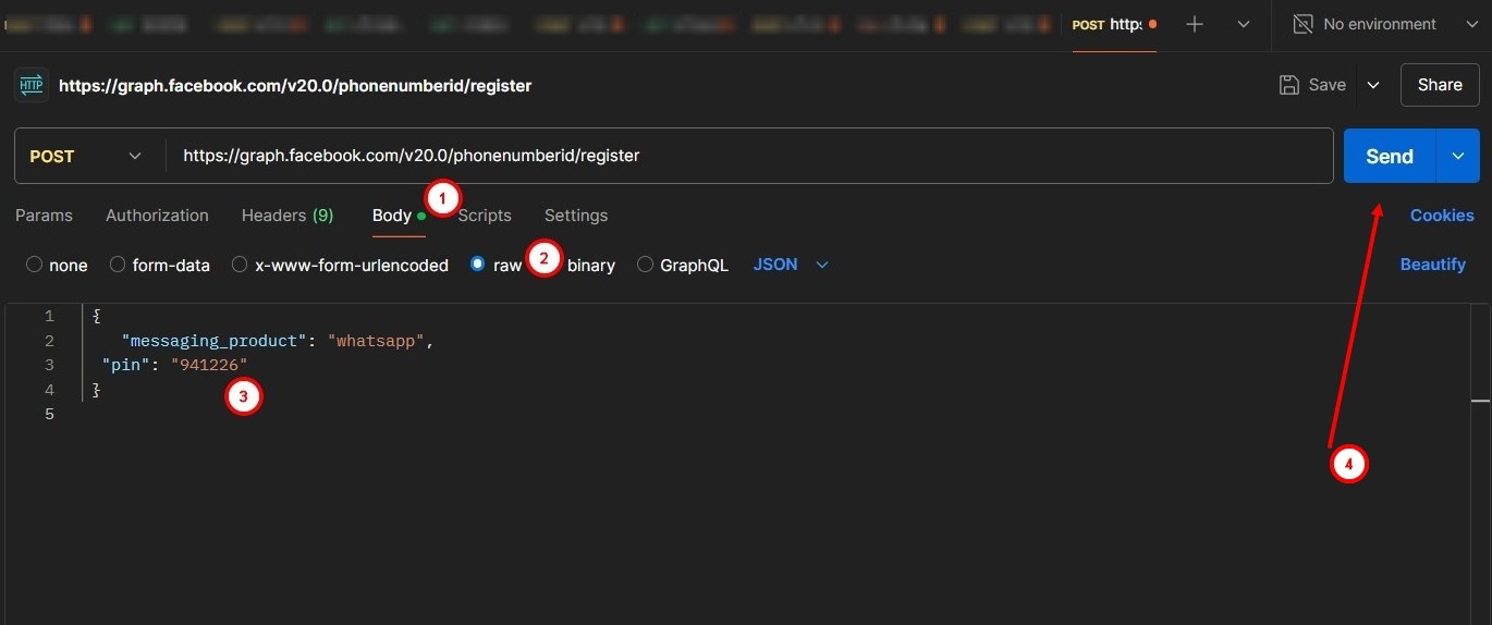 - Open Postman, create a new POST request, and in the request line enter: https://graph.facebook.com/v20.0/phonenumberid/register, where the phonenumberid is the id of the number to be connected.