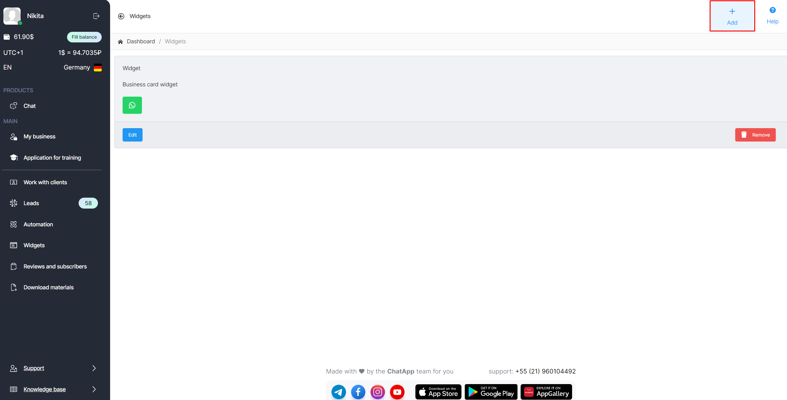 When the widget is added to the site, but needs to be edited, you can go to your Personal Account and click on the “Edit”button. If you no longer need this widget, you can click on the “Remove” button.