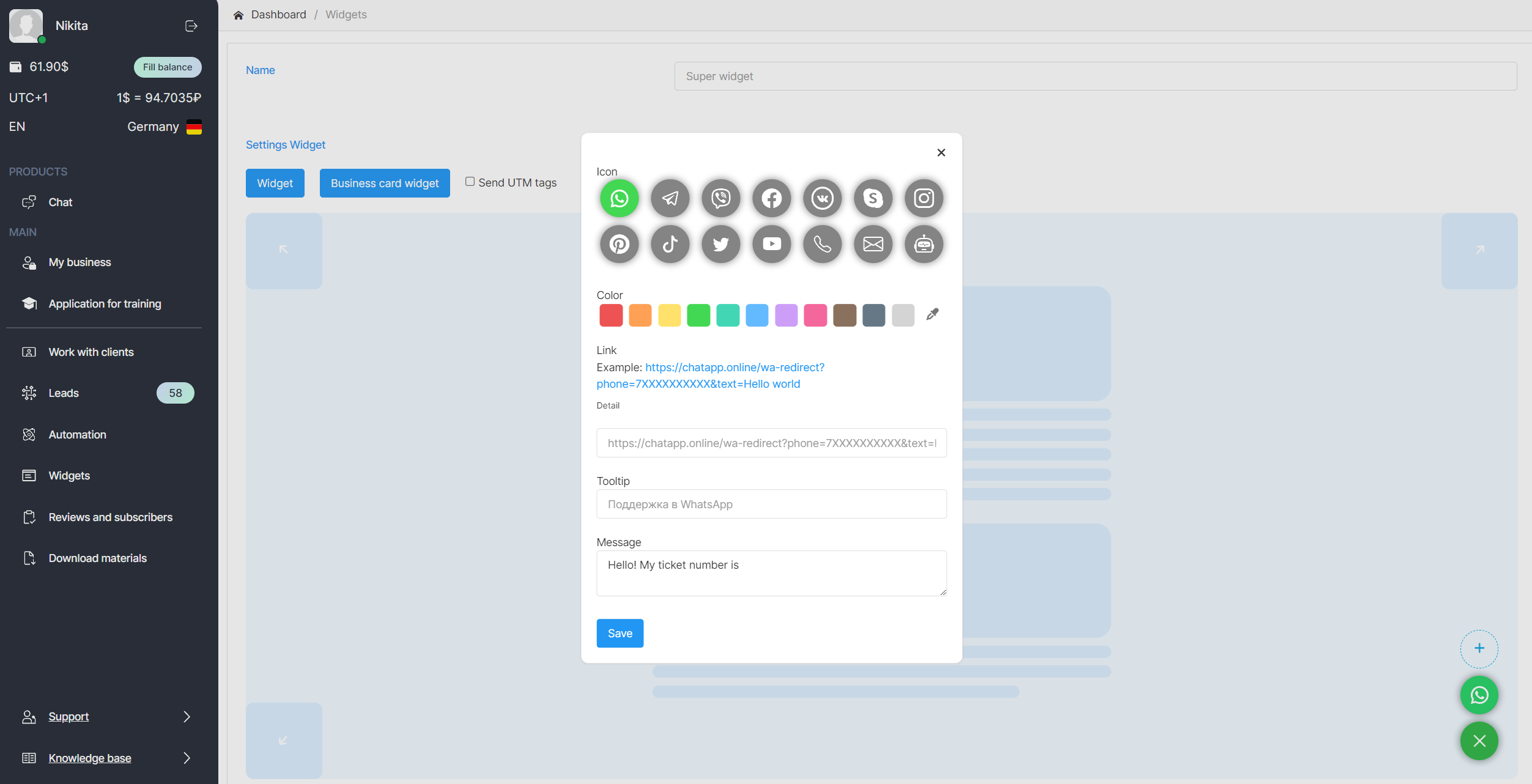 ► Make the necessary changes to the widget – add or remove instant messengers, change icon colors or change tips, and then click on the “Save” button.